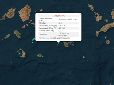 Σεισμός 3,3 βαθμών της κλίμακας Ρίχτερ σημειώθηκε το μεσημέρι της Τρίτης (2/7) 17χλμ δυτικά της Αστυπάλαιας.