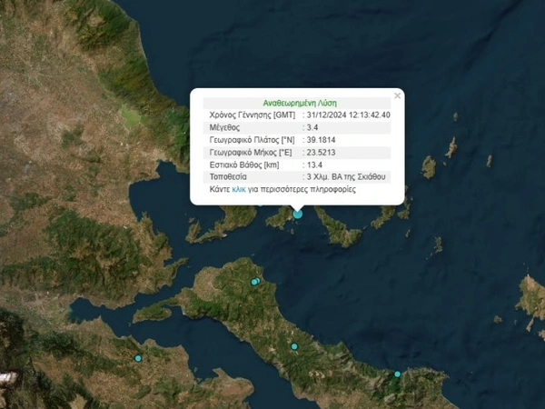 Σεισμός 3,4 βαθμών της Κλίμακας Ρίχτερ, σημειώθηκε στις 15:13 ανοικτά της Σκιάθου.