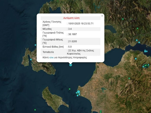 Σεισμική δόνηση έγινε αισθητή περίπου στις 21:25 το βράδυ της Παρασκευής (10/1), σε περιοχές της Αχαΐας, της Ηλείας, της Αιτωλοακαρνανίας και της Κεφαλονιάς.