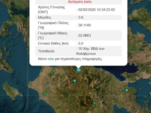 Σεισμική δόνηση σημειώθηκε σήμερα (2/2) στα Καλάβρυτα, λίγο μετά τις 12:30, σύμφωνα με την προκαταρκτική μέτρηση του Γεωδυναμικού Ινστιτούτου.