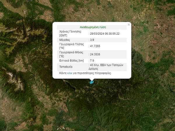 Ο πρώτος σεισμός των 3,9 Ρίχτερ κοντά στη Δράμα, όπως αναφέρουν οι πρώτες πληροφορίες από το Γεωδυναμικό Ινστιτούτο, είχε εστιακό βάθος 7,9 χιλιομέτρων ενώ το επίκεντρό του βρίσκεται 43 χιλιόμετρα βόρεια, βορειοανατολικά των Ποταμών.