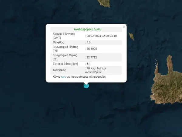 Ο σεισμός 4,3 Ρίχτερ στην Κρήτη, ειδικότερα, καταγράφηκε 70 χιλιόμετρα νοτιοδυτικά των Αντικυθήρων, με το Ευρωμεσογειακό Ινστιτούτο να αναφέρει πως το εστιακό του βάθος υπολογίζεται στα 10 χιλιόμετρα.