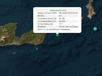 Σεισμός 4,4 βαθμών της Κλίμακας Ρίχτερ, σημειώθηκε στις 10:02 κοντά στις ανατολικές ακτές της Κρήτης.