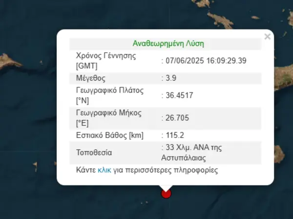 Σεισμός, μεγέθους 3,9 βαθμών της κλίμακας Ρίχτερ, σημειώθηκε το απόγευμα του Σαββάτου (7/6), ανοιχτά της Αστυπάλαιας.