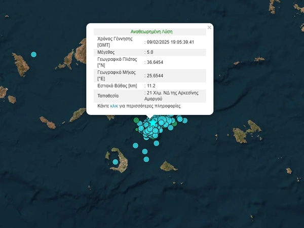 Το εστιακό βάθος του σεισμού στην Αμοργό υπολογίζεται στα 11,2 χιλιόμετρα, ενώ το επίκεντρο της ισχυρής δόνησης, που έγινε αισθητή σε διάφορες περιοχές της Αθήνας, εντοπίζεται 21 χιλιόμετρα νοτιοδυτικά της Αρσεκίνης.