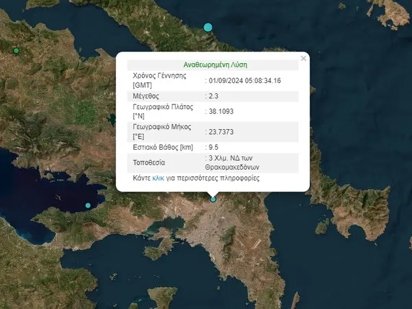 Σύμφωνα με την πρώτη εκτίμηση του Γεωδυναμικού Ινστιτούτου, το εστιακό βάθος του σεισμού στην Αθήνα υπολογίζεται στα 9,5 χιλιόμετρα ενώ το επίκεντρό του βρίσκεται 3 χιλιόμετρα νοτιοδυτικά των Θρακομακεδόνων.