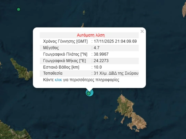 Ισχυρός σεισμός μεγέθους 4,5 Ρίχτερ σημειώθηκε το βράδυ της Δευτέρας (17/11) 29 χιλιόμετρα δυτικά-βορειοδυτικά της Σκύρου, προκαλώντας αισθητή δόνηση και στην Αττική.