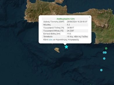 Οι πρώτες πληροφορίες, όπως προκύπτουν από την αναθεωρημένη λύση του Γεωδυναμικού Ινστιτούρου, για τον σεισμό στην Κρήτη κάνουν λόγο πως το εστιακό βάθος εντοπίζεται στα 11,6 χιλιόμετρα ενώ το επίκεντρό του 15 χιλιόμετρα ανατολικά, βορειοανατολικά της Γαύδου.
