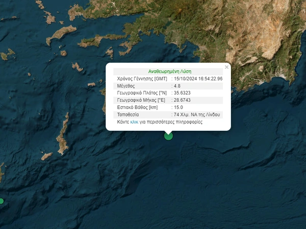 Σεισμός σημειώθηκε στη θαλάσσια περιοχή ανοιχτά της Ρόδου. Σύμφωνα με την αναθεωρημένη λύση του Γεωδυναμικού Ινστιτούτου του Εθνικού Αστεροσκοπείου Αθηνών, ο σεισμός είχε μέγεθος 4,8 βαθμών της κλίμακας Ρίχτερ.