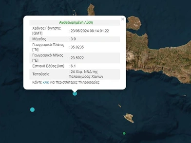 Σεισμός στην περιοχή των Χανίων καταγράφηκε 11:14. Σύμφωνα με το σύστημα ενημερώσεων του Ευρωμεσογειακού και Γεωδυναμικού Ινστιτούτου η ένταση του σεισμού είναι 3,9 Ρίχτερ.