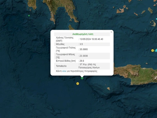 Σεισμός σημειώθηκε στα Χανιά, στη θαλάσσια περιοχή νότια της Κρήτης. Σύμφωνα με την αναθεωρημένη λύση του Γεωδυναμικού Ινστιτούτου του Εθνικού Αστεροσκοπείου Αθηνών, η σεισμική δόνηση είχε μέγεθος 3,5 βαθμών της κλίμακας Ρίχτερ.