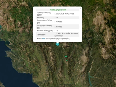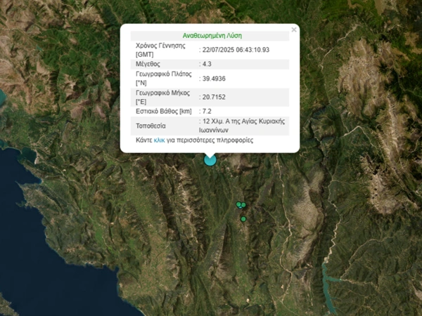 Όπως καταγράφει η υπηρεσία, η ισχυρή δόνηση καταγράφηκε περί τις 09:43 σήμερα (22/7), με επίκεντρο 12 χιλιόμετρα ανατολικά της Αγίας Κυριακής Ιωαννίνων, και με εστιακό βάθος 7,2 χιλιομέτρων, καθιστώντας τον ιδιαίτερα αισθητό στην περιοχή.
