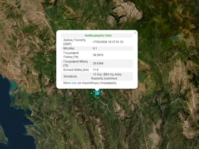 Σεισμός τώρα, που καταγράφηκε από τα όργανα του Γεωδυναμικού Ινστιτούτου στα Ιωάννινα, έφτασε σε μέγεθος τα 4,1 Ρίχτερ και έγινε αισθητός στην ευρύτερη περιοχή.