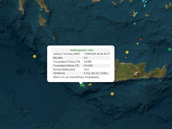 Σεισμός μεγέθους 4 βαθμών της Κλίμακας Ρίχτερ σημειώθηκε σήμερα Σάββατο (13/9) στις 11:44 π.μ. στη Γαύδο.