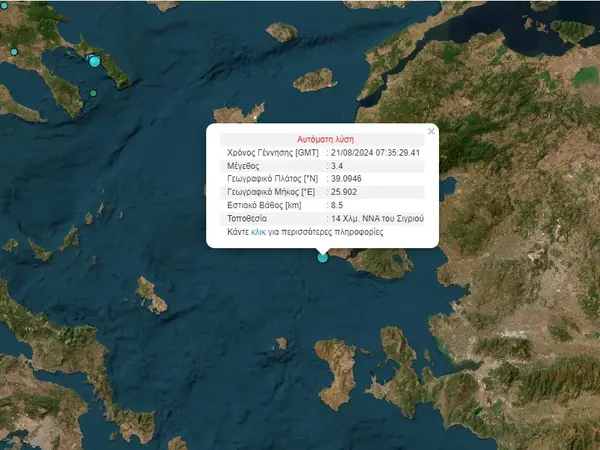 Σεισμός τώρα μεγέθους 3,4 βαθμών της κλίμακας Ρίχτερ σημειώθηκε στη Λέσβο, σύμφωνα με την αυτόματη λύση του Γεωδυναμικού Ινστιτούτου του Εθνικού Αστεροσκοπίου Αθηνών.