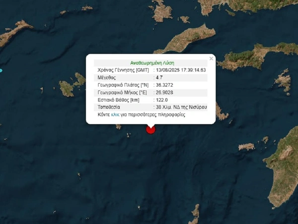 Σύμφωνα με την Αναθεωρημένη λύση του Γεωδυναμικού Ινστιτούτου, η ισχυρή δόνηση είναι μεγέθους 4,7 Ρίχτερ, και σημειώθηκε περί τις 20:39 σήμερα (13/8), με επίκεντρο 38 χλμ. νοτιοδυτικά της Νισύρου, και με εστιακό βάθος 122 χιλιομέτρων.