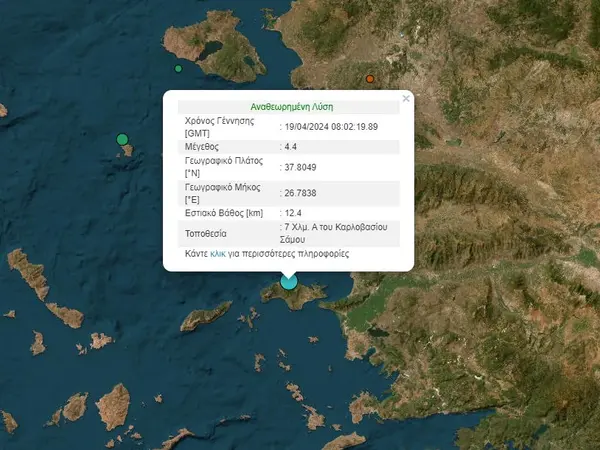 Σεισμός σημειώθηκε στη Σάμο. Σύμφωνα με την αναθεωρημένη λύση του Γεωδυναμικού Ινστιτούτο του Εθνικού Αστεροσκοπίου Αθηνών, ο η σεισμική δόνηση είχε μέγεθος 4,4 βαθμών της κλίμακας Ρίχτερ.