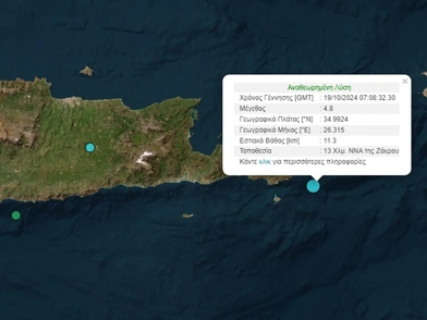 Σεισμός 4,8 Ρίχτερ σημειώθηκε στις 10:08 το πρωί του Σαββάτου (19/10) στη θαλάσσια περιοχή ανοιχτά του Λασιθίου στη νότια Κρήτη.