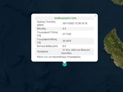 Σεισμός στη Ζάκυνθο καταγράφηκε στις 12:39 το μεσημέρι της Πέμπτης. Σύμφωνα με αναθεώρηση από το σύστημα ενημερώσεων του Γεωδυναμικού Ινστιτούτου η ένταση του σεισμού είναι 4,4 Ρίχτερ.