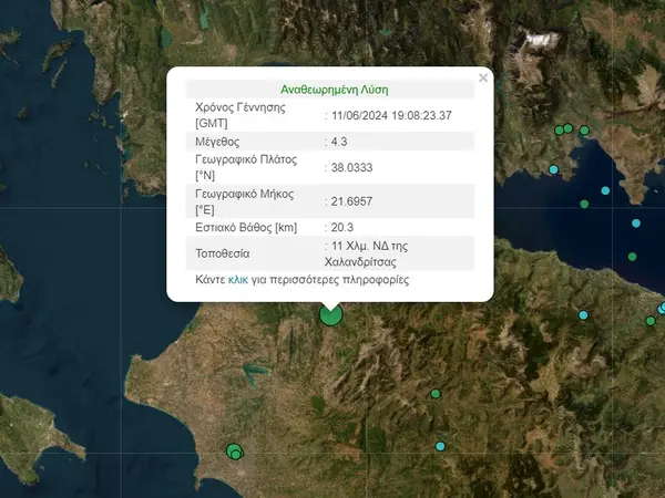Σεισμός έγινε αισθητός στην Αχαΐα. Σύμφωνα με την αναθεωρημένη λύση του Γεωδυναμικού Ινστιτούτου του Εθνικού Αστεροσκοπείου είχε μέγεθος 4,3 βαθμών της κλίμακας Ρίχτερ.