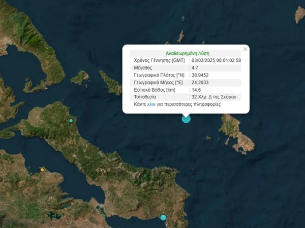 Σεισμός μεγέθους 4,7 Ρίχτερ σημειώθηκε στις 10:01 το πρωί της Δευτέρας (03/02) ανοιχτά της Σκύρου, ενώ έγινε αισθητός στην Αθήνα.