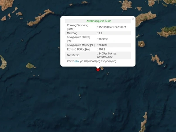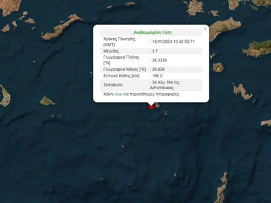 Σεισμός σημειώθηκε ανοικτά της Αστυπάλαιας το απόγευμα της Παρασκευής (15/11) στις 16:42, με τη δόνηση να έχει μέγεθος 3,7 βαθμών της κλίμακας Ρίχτερ.