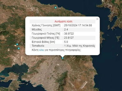 Σεισμός μεγέθους 2,4 Ρίχτερ σημειώθηκε στις 20:14 της Παρασκευής (25/10) στην Αθήνα, με επίκεντρο την Κηφισιά.