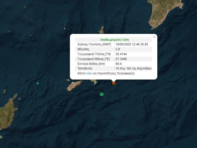 Σεισμός μεγέθους 3,9 Ρίχτερ σημειώθηκε ανοικτά της Καρπάθου στις 15:40 της Παρασκευής (16/05).