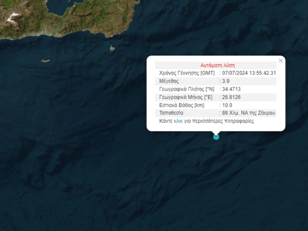 Το εστιακό βάθος του σεισμού στην Κρήτη, υπολογίζεται στα 10 χιλιόμετρα ενώ το επίκεντρό του εντοπίζεται 86 χιλιόμετρα νοτιοανατολικά της θαλάσσιας περιοχής της Ζάκρου.