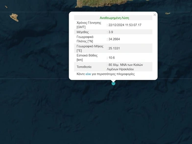 Ασθενής σεισμός στην περιοχή της Κρήτης καταγράφηκε στις 01:53 το μεσημέρι της Κυριακής. Σύμφωνα με το σύστημα ενημερώσεων του Ευρωμεσογειακού και Γεωδυναμικού Ινστιτούτου η ένταση του σεισμού είναι 3,9 Ρίχτερ.