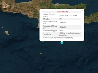 Σεισμός τώρα στην περιοχή της Κρήτης καταγράφηκε στις 18:47 το απόγευμα της Παρασκευής (05/07). Σύμφωνα με το σύστημα ενημερώσεων του Ευρωμεσογειακού και Γεωδυναμικού Ινστιτούτου, η ένταση του σεισμού είναι 4 Ρίχτερ.