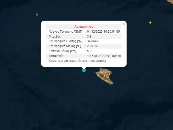 Σύμφωνα με τις πρώτες πληροφορίες από το Γεωδυναμικό Ινστιτούτο, ο σεισμός σημειώθηκε στην Κρήτη, 22 χιλιόμετρα δυτικά νοτιοδυτικά της Γαύδου συγκεκριμένα, και είχε εστιακό βάθος 15,3 χλμ.