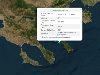 Η σεισμική δόνηση, μεγέθους 4,1 Ρίχτερ, σημειώθηκε σε περιοχή 11 χιλιόμετρα Δυτικά Βορειοδυτικά των Καρυών στο Άγιο Όρος.