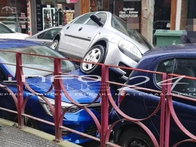 Η οδηγός ενός αυτοκινήτου, έχασε τον έλεγχο του οχήματός της κάτω από άγνωστες συνθήκες και κατέληξε κυριολεκτικά πάνω σε σταθμευμένα οχήματα.