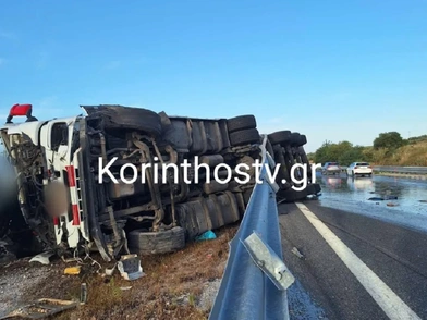 Σύμφωνα με το Korinthostv, ο οδηγός φορτηγού έχασε τον έλεγχο του οχήματος όταν έσκασε το λάστιχο.