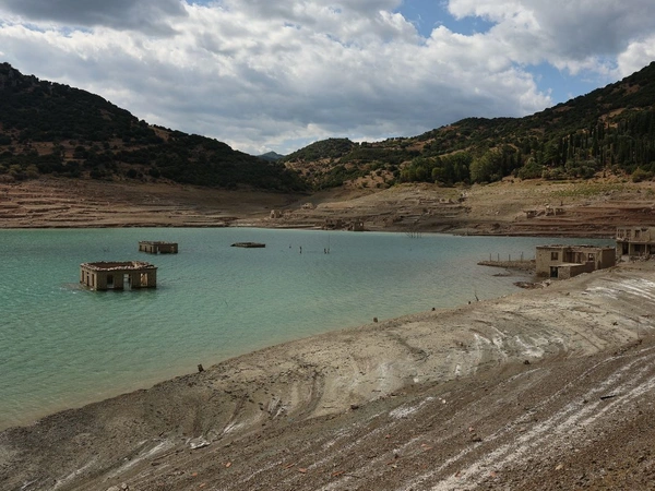 Η δραματική υποχώρηση της στάθμης αποκαλύπτει ένα απόκοσμο τοπίο, με το βυθισμένο χωριό Κάλλιο -όπως φαίνεται και στα πλάνα του drone του Orange Press Agency, από τις 15 Σεπτεμβρίου του 2025- να έχει αναδυθεί, θυμίζοντας εικόνες από την περίοδο της μεγάλης ξηρασίας στις αρχές της δεκαετίας του '90.