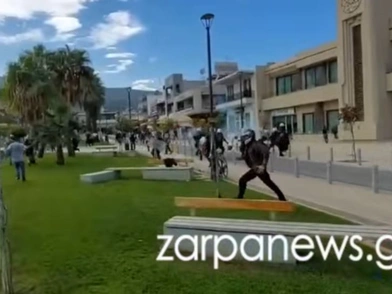 Δείτε το στιγμιότυπο από το 0:17 όταν μπαίνει στο πλάνο ο άνδρας με το κράνος μέχρι το σημείο που του επιτίθενται τα ΜΑΤ, στο βίντεο του zarpanews.gr