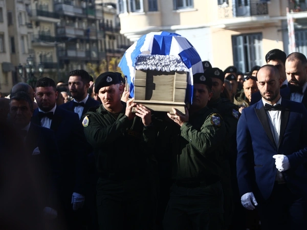 Ανείπωτος πόνος στην κηδεία του 31χρονου αστυνομικού που τραυματίστηκε θανάσιμα από ναυτική φωτοβολίδα στου Ρέντη, η οποία πραγματοποιήθηκε στον Ιερό Ναό Αγίου Δημητρίου στην Θεσσαλονίκη.
