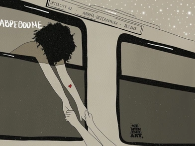 Ένα νεαρό άτομο - σαν τα δεκάδες που έχασαν τη ζωή τους στις 28 Φεβρουαρίου του 2023 - απλώνεται από το παράθυρο του συρμού για να πιάσει δύο χέρια, που είναι απρόθυμα να το αφήσουν.