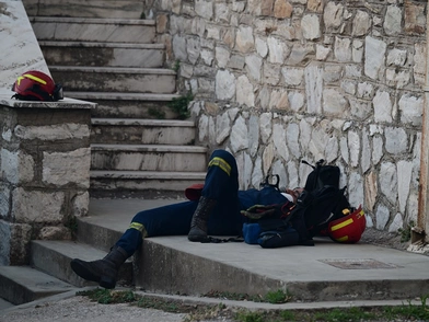 Συγκλονίζει η εικόνα με τον πυροσβέστη να κοιμάται αποκαμωμένος στα σκαλιά κτιρίου στην Αττική, μετά από ολονύχτια μάχη με τη φωτιά που οδήγησε σε μπαράζε εκκενώθεων οικισμών, νοσοκομείων και μοναστηριών.