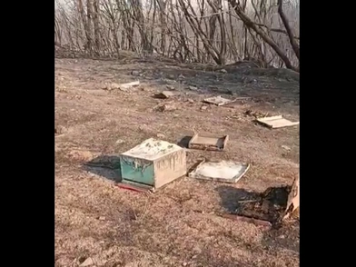 Με λυγμούς αποχαιρετά τις μέλισσες του, ενώ περπατά ανάμεσα στα καμμένα μελίσια του. Μόνο μερικά έχουν μείνει και λιγοστές μέλισσες πετούν γύρω από τον Γιώργο Καραφυλλίδη που κλαίει απαρηγόρητος.