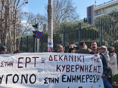 Συγκέντρωση έξω από το Ραδιομέγαρο πραγματοποίησαν σωματεία εργαζομένων της ΕΡΤ, εκφράζοντας τη διαμαρτυρία τους για τον τρόπο με τον οποίο κάλυψε η Δημόσια Ραδιοτηλεόραση τις κινητοποιήσεις για τα Τέμπη.