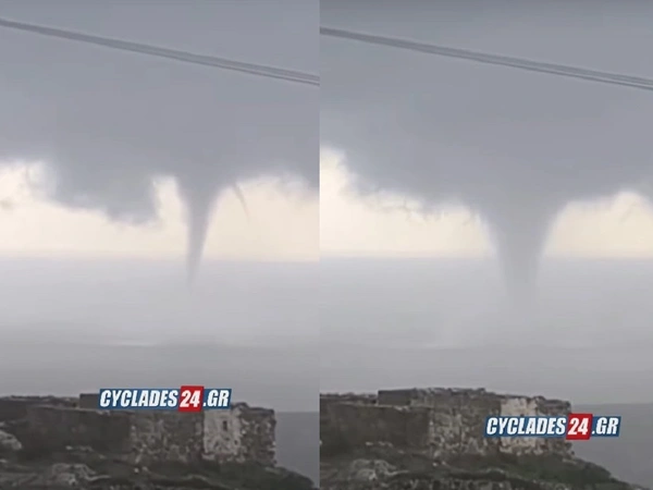Ένα σπάνιο και εντυπωσιακό φυσικό συμβάν καταγράφηκε στη Φολέγανδρο, όπου ένας μεγάλος υδροστρόβιλος σχηματίστηκε κοντά σε παραλία του νησιού.