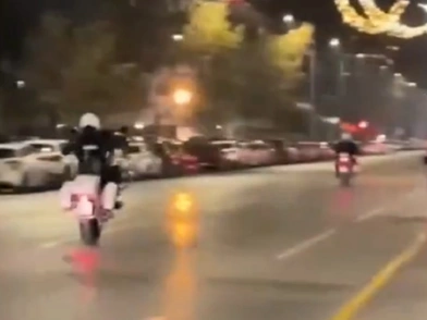 Τρεις μοτοσικλέτες της αστυνομίας προσπερνούν τα οχήματα και μόλις ανάβει πράσινο, ο ένας μοτοσικλετιστής αστυνομικός, αρχίζει να κάνει σούζες.