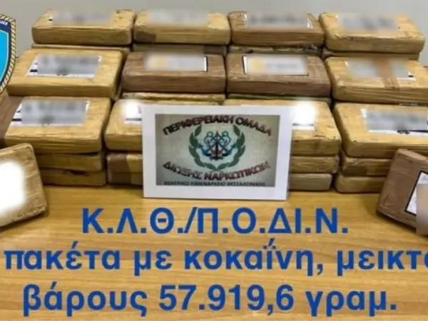 Πενήντα πλαστικές συσκευασίες περιέχουσες πιθανώς κοκαΐνη, εντοπίστηκαν το πρωί της Παρασκευής (9/5), στο λιμάνι Θεσσαλονίκης, συνολικού μεικτού βάρους πενήντα επτά κιλών και εννιακοσίων δέκα εννέα γραμμαρίων (57.919,6 γρ) στους ψυκτικούς μηχανισμούς ενός ψυγείου- εμπορευματοκιβωτίου με μπανάνες, προερχόμενο από το λιμάνι του Εκουαδόρ.