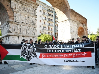 Με κεντρικό σύνθημα «Ο ΠΑΟΚ είναι παιδί της προσφυγιάς» εκατοντάδες φίλοι του «Δικεφάλου» συγκεντρώθηκαν σήμερα στην Καμάρα, στο κέντρο της Θεσσαλονίκης, και πραγματοποίησαν πορεία αλληλεγγύης στην Παλαιστίνη, ενόψει του αγώνα της ομάδας με τη Μακάμπι Τελ Αβίβ για την πρώτη αγωνιστική του League Phase του Europa League.