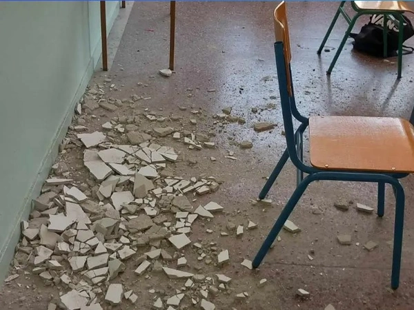 Οι σοβάδες έπεσαν σχεδόν πάνω στο τελευταίο θρανίο, με τον μαθητή που κάθονταν εκεί να γλιτώνει καθαρά από τύχη. «Εν ώρα μαθήματος χθες έπεσε ένα πολύ μεγάλο κομμάτι από το ταβάνι ακριβώς πίσω από τον μαθητή, τον πέρασε ξυστά», λέει στο MEGA, η Βάσω Κοχλιαρίδου, μέλος συλλόγου γονέων και κηδεμόνων.