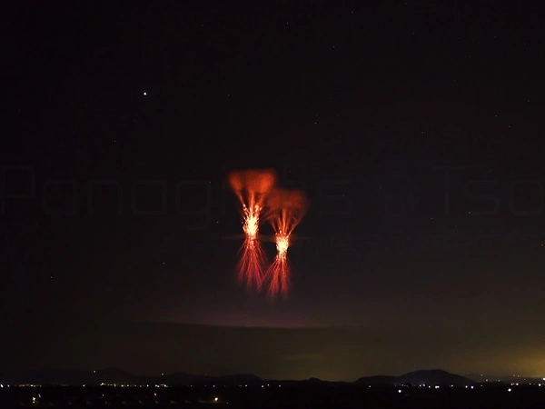 Το φαινόμενο απαθανάτισε χρήστης των social media και ανήρτησε φωτογραφία αναφέροντας: «Ένα διπλό red sprite απο την καταιγίδα στο Αιγαίο πριν λίγη ώρα. Ο μητρικός κεραυνός που τα δημιούργησε εντοπίστηκε στην Ικαρία και είχε ένταση 76κΑ. Ευτυχώς σήμερα οι συνθήκες ήταν με το μέρος μου. (Λήψη από Λιβαδειά με 35mm φακό.)».