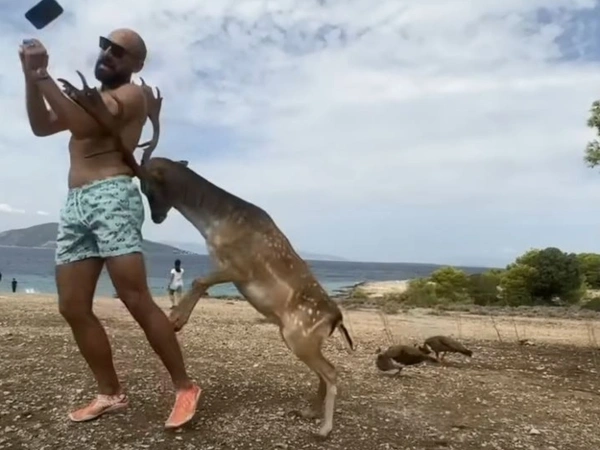 Μία δυσάρεστη έκπληξη περίμενε έναν τουρίστα στην Αίγινα όταν στην προσπάθειά του να βγάλει μία selfie μπροστά από ελάφι, δέχτηκε την απρόσμενη επίθεση του ζώου με αποτέλεσμα να χτυπήσει στα πλευρά.