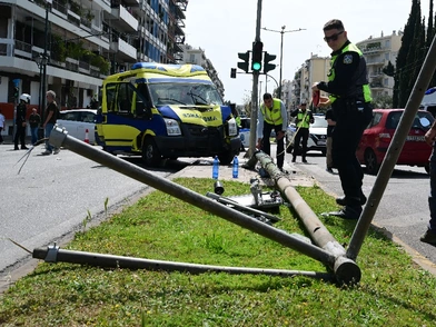 Στη συμβολή των οδών Βασιλέως Γεωργίου Β’ και Βασιλέως Κωνσταντίνου το ιδιωτικό ασθενοφόρο συγκρούστηκε με αυτοκίνητο, με αποτέλεσμα να βγει από την πορεία του και να πέσει επάνω σε κολώνα φωτισμού, η οποία καταπλάκωσε δύο πεζούς.